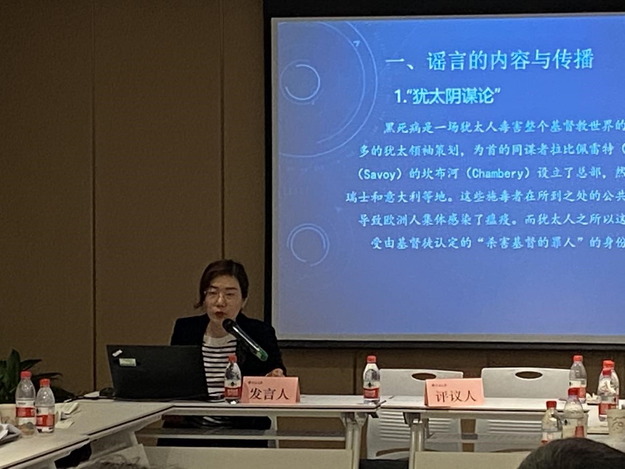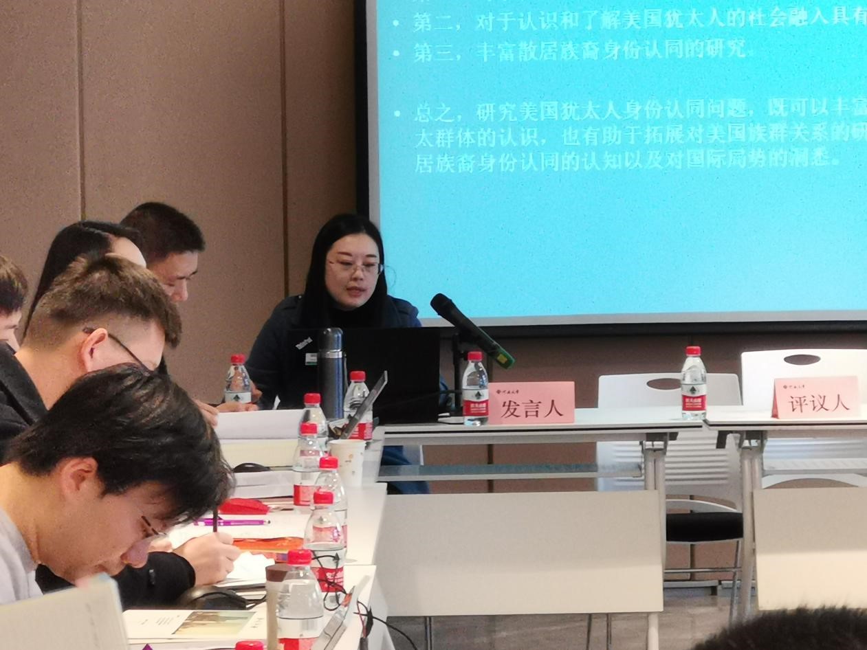 第三场主题为“国别与区域研究”,由冯东兴副教授主持,杨松涛副教授、肖文超副教授进行评议。汇报的论文有RUTH的 “The Colonial Legacy and the Evolution of the Social Status of Women, with Reference to Egypt (1952-2016)”;Amr Mansour的 “Historical Investigation on China-Saudi Arabia Relations: Analysis from the Perspective of Political and Economic Exchanges”;吴华《二战后犹太人对美国传媒业影响研究》;马梦洋《犹太联合募捐协会研究(1939-1999)》;贾珍《黎巴嫩的德鲁兹人政治参与研究》;王越广《时代的记忆:埃米尔·法肯海姆的犹太思想研究》; 陈锐《美国对巴勒斯坦的打压、排挤政策研究》;吴丁洋《古典时期巴勒斯坦犹太会堂研究》;李舒扬《弥赛亚主义与中世纪犹太流散政治》;陈莎莎《黑死病时期犹太人与基督徒的关系》;朱晓《黑死病期间的“反犹式”谣言》。杨松涛副教授、肖文超副教授对论文的优点和存在的问题进行了逐一点评。杨松涛副教授在评论朱晓老师的文章时,认为文章框架逻辑清晰,同时建议应加入对谣言史的探讨来谈论反犹研究。